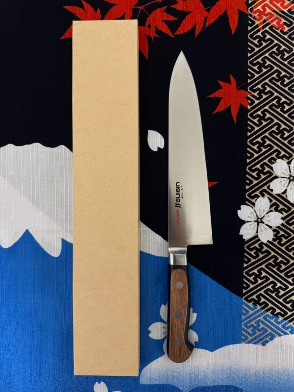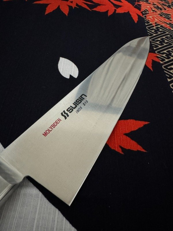 Los cuchillos Suisin Inox son muy recomendados para aquellos que están aprendiendo a afilar sus cuchillos con piedra. Esta serie tiene hojas delgadas y fáciles de afilar, hechas de acero japonés AUS-8. Su mango bi-tono, simple y hermoso, logra un cuchillo bien balanceado.