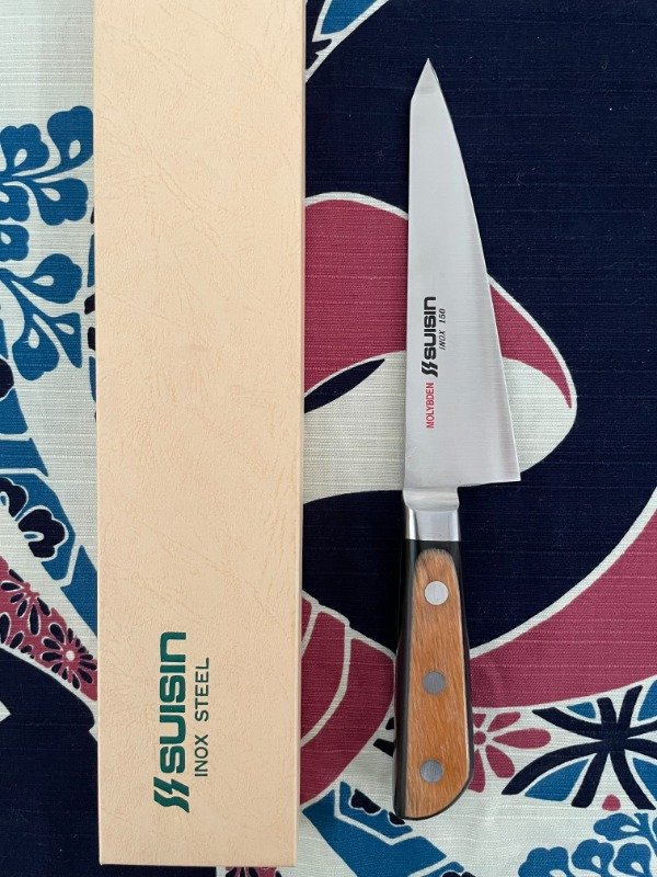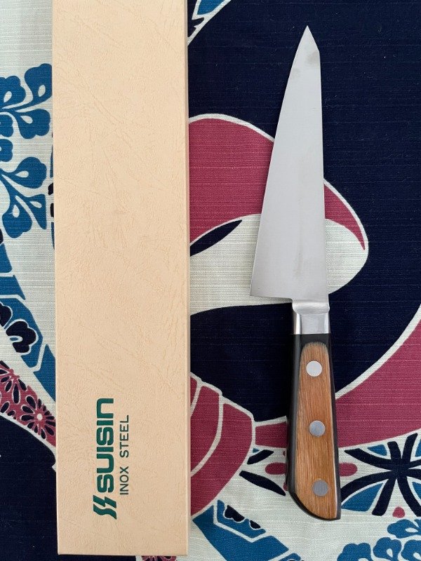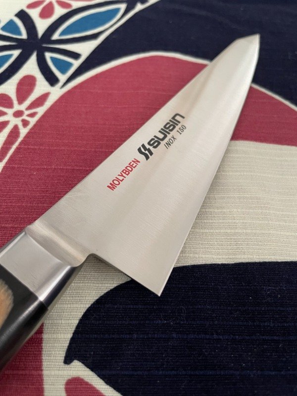 Los cuchillos Suisin Inox son muy recomendados para aquellos que están aprendiendo a afilar sus cuchillos con piedra. Esta serie tiene hojas fáciles de afilar, hechas de acero japonés AUS-8. Su mango bi-tono, simple y hermoso, logra un cuchillo bien balanceado.